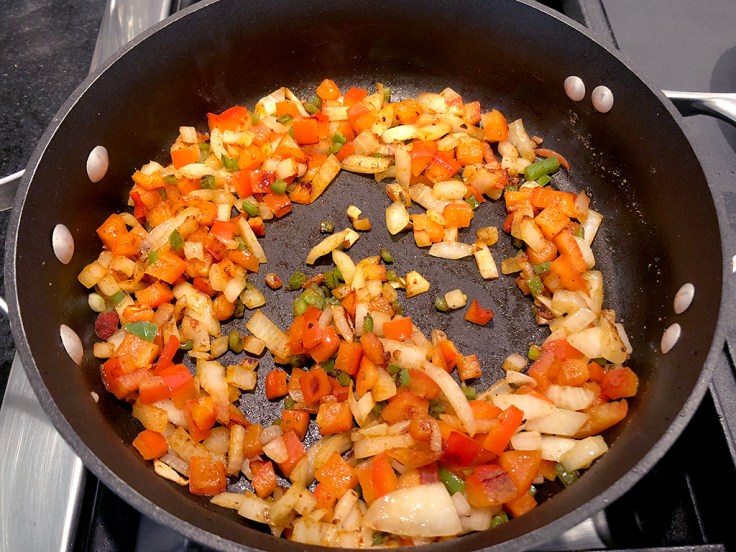 - Once hot, add the onions, peppers, and jalapeno to the pan. Sautee them until soft and the onions are translucent. It’s ok if they take on a little char in the process.