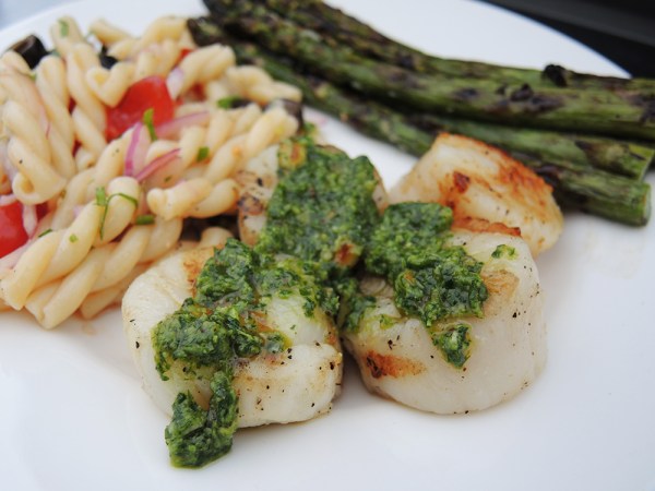 Grilled Scallops with a Cilantro Pesto and Grilled Asparagus